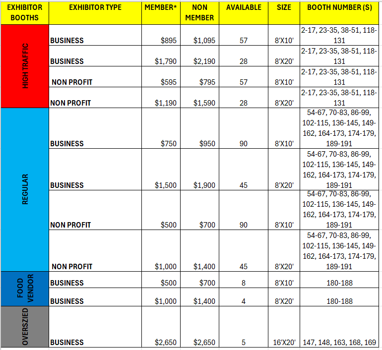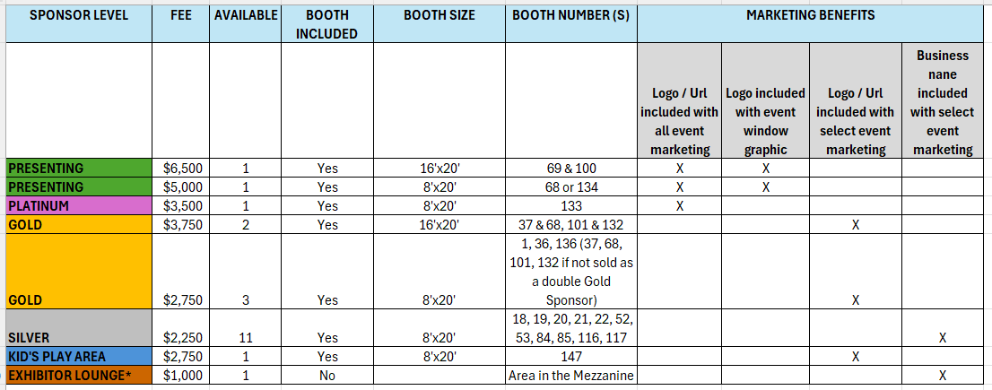 *Exhibitor Lounge Sponsor = Required to provide beverages and snacks for the exhibitors to be served in the Mezzanine the days of the event.