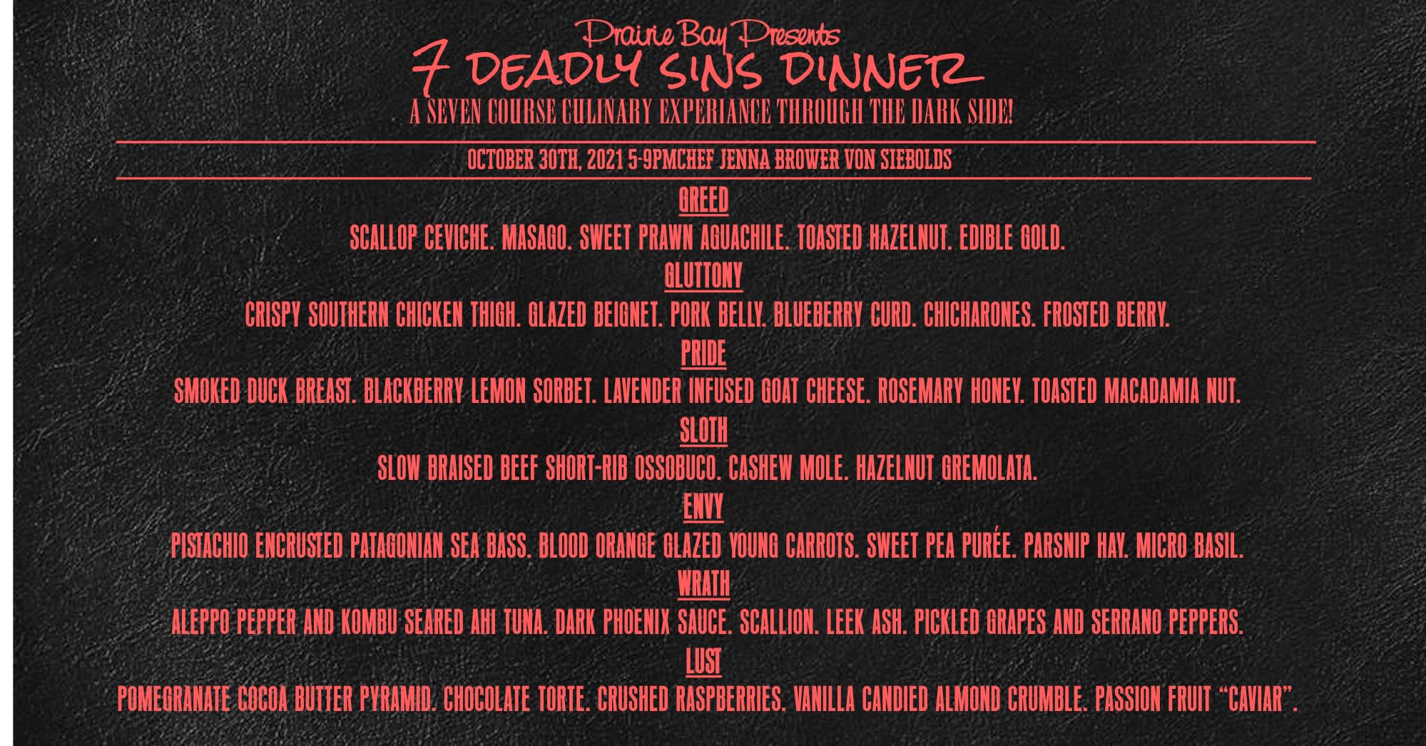 Join us for a 7 Course Culinary Experience through the Dark Side at Prairie Bay, Saturday October 30th! $75 for 7 Courses. 7 Drink Pairings. One great experience from Executive Chef Jenna Brower Von SieboldsAdditional Info
