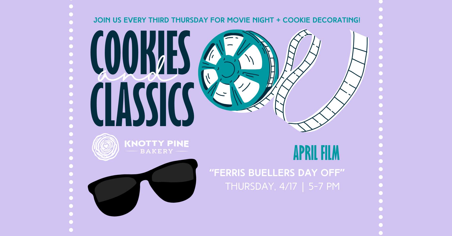 Join us at Knotty Pine Bakery for our Cookies and Classics Event! The film this month is 'Ferris Buellers Day Off'! We start streaming the movie at 5pm but feel free to stop in anytime between 5-7pm. We will have FREE popcorn while supplies last.Additional Info