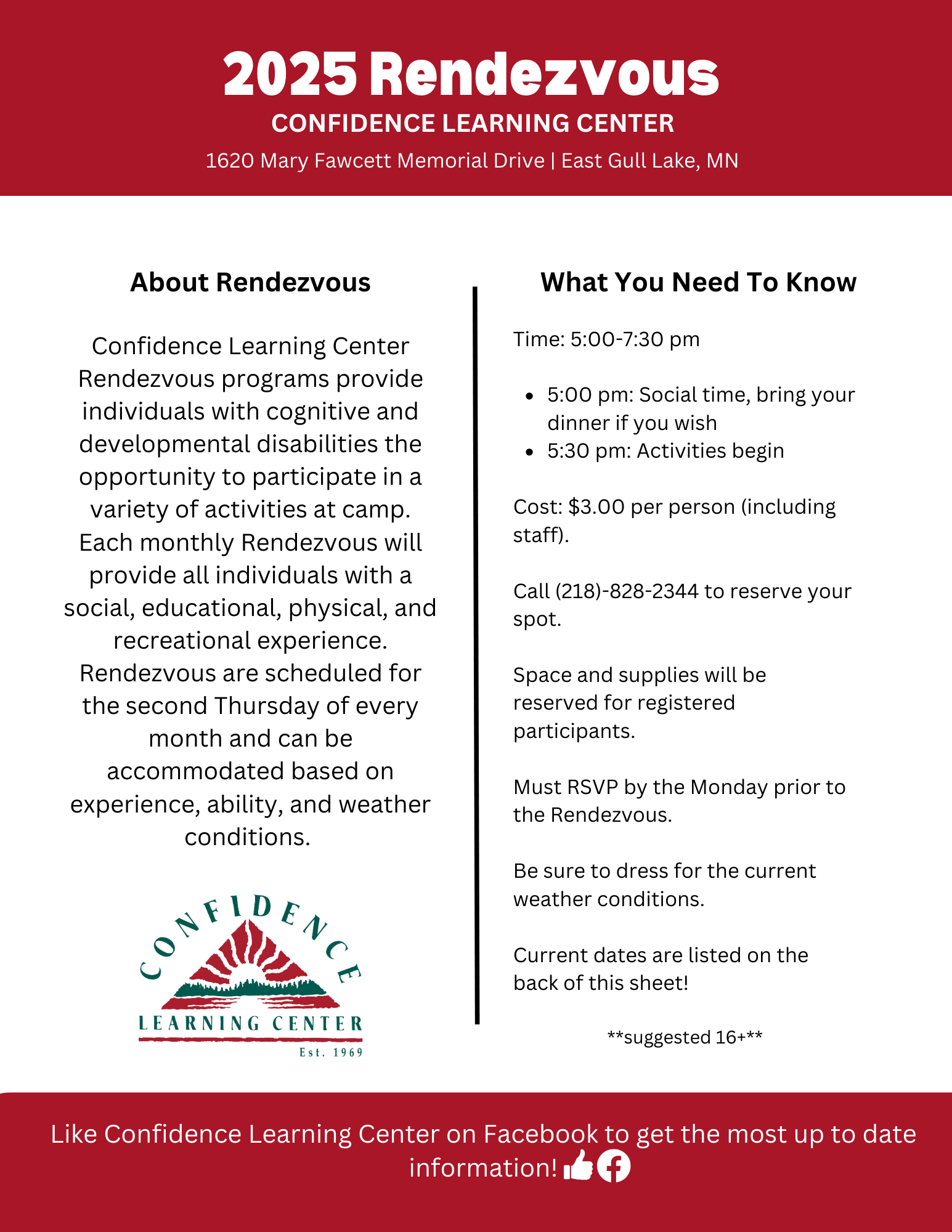 Confidence Learning Center Rendezvous programs provide individuals with cognitive and developmental disabilities the opportunity to participate in a variety of activities at camp. Each monthly Rendezvous will provide all individuals with a social, educational, physical, and recreational experience. Rendezvous are scheduled for the second Thursday of every month and can be accommodated based on experience, ability, and weather conditions. Please call our office at 218-828-2344 for more information or to RSVP. Theme for tonight is: Tiki Tubing!