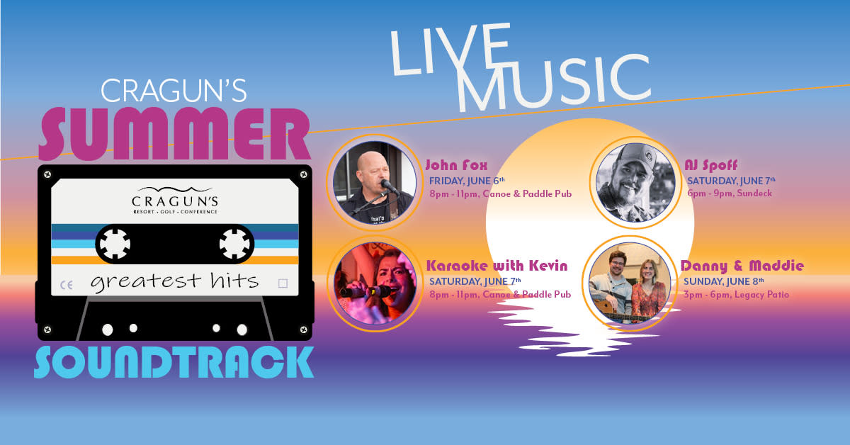 Get ready to soak up the sounds of summer with Cragun's Summer Soundtrack, a live music series that brings incredible artists to Cragun's Resort and Legacy Courses. Whether you're unwinding on the Sun Deck, enjoying the lively atmosphere at the Canoe & Paddle Pub, or taking in the stunning golf course views on the Legacy patio, these performances will set the perfect tone for your getaway. From toe-tapping tunes to soulful melodies, each show will energize the crowd, spark unforgettable moments, and create the ultimate vacation soundtrack. Don't miss out on the music, the memories, and the magic of summer at Cragun's!