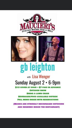 Join us at Maucieri's Italian Bistro, Bar & Deli for some great live music!GB Leighton with Lisa Wenger will entertain you OUTDOORS, with all the safety protocols in place. Bring your own lawn chair and face mask. Beverages and food will be available outdoors, or enjoy a full menu inside (be sure to make a reservation).