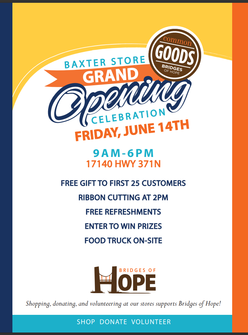 Join us on June 14th from 9am-6pm for our Grand Opening Celebration at our new Baxter Common Goods location! Just a mile and a half north on 371 from our previous location, our new store is something you do not want to miss out on. A free prize will be given to the first 25 customers, complimentary refreshments, giveaways, and an on-site food truck. Don't miss out on the fun!