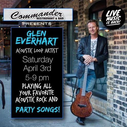 Live music is back at JJ's Pub (lower level of The Commander Restaurant and Bar) on Saturday, April 3, from 5:00-9:00PM.Glen Everhart - Acoustic loop artist will be playing all of your favorite acoustic and rock party songs!