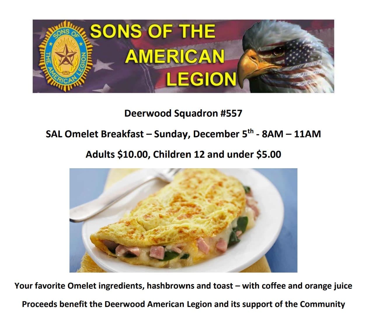 The Sons of the American Legion Squadron #557 will host this event at the Walter Scott Erickson Legion Post, on Forest Road in Deerwood. Your favorite Omelet ingredients, hashbrowns and toast – with coffee and orange juice will be served. Proceeds benefit the Deerwood American Legion and its support of the Community.Additional Info