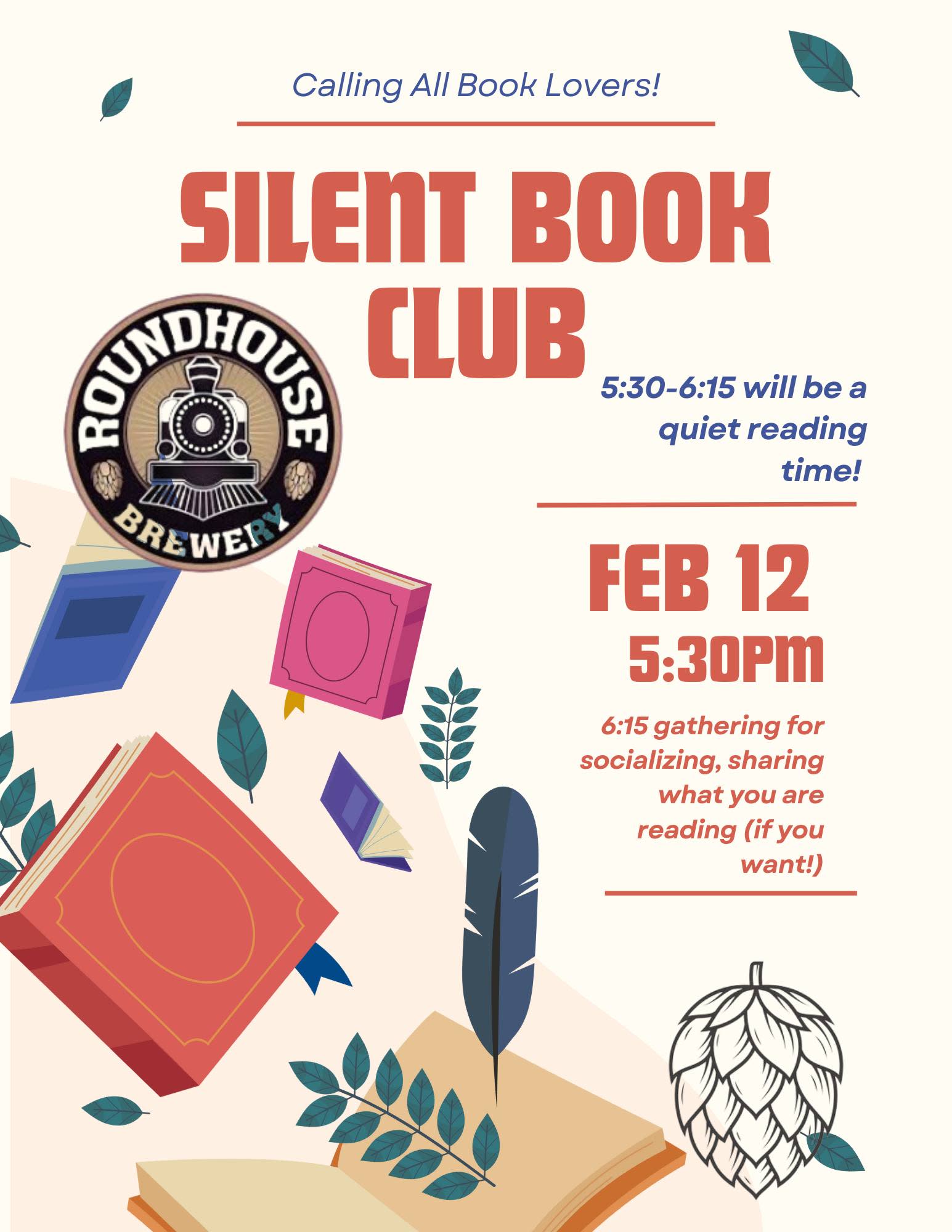 We're trying something new! Join us for SILENT BOOK CLUB! We'll start at 5:30 with a quiet reading time. At 6:15 well for some socializing (if you want!) You can share the book you're reading and talk with other book lovers while drinking your favorite beer or NA beverage!