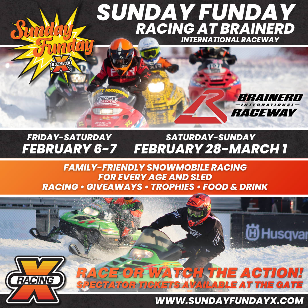 Sunday Funday Snowmobile Racing is a family-friendly, grassroots snowmobile race series ran by X Racing. We focus on creating a fun, accessible racing series, while also building a race community. The series welcomes riders of all ages, sleds, and skill levels in a laid-back, safety-first environment, with trophies for all racers, giveaways throughout the weekend, and a strong emphasis on creating a welcoming place where racers, families, and fans can connect and enjoy the sport together. Sunday Funday is great for new racers of every age. We will be hosting races at Brainerd International Raceway on Friday 2/6 - Saturday 2/7 and Saturday 2/28 - Sunday 3/1.Additional Info