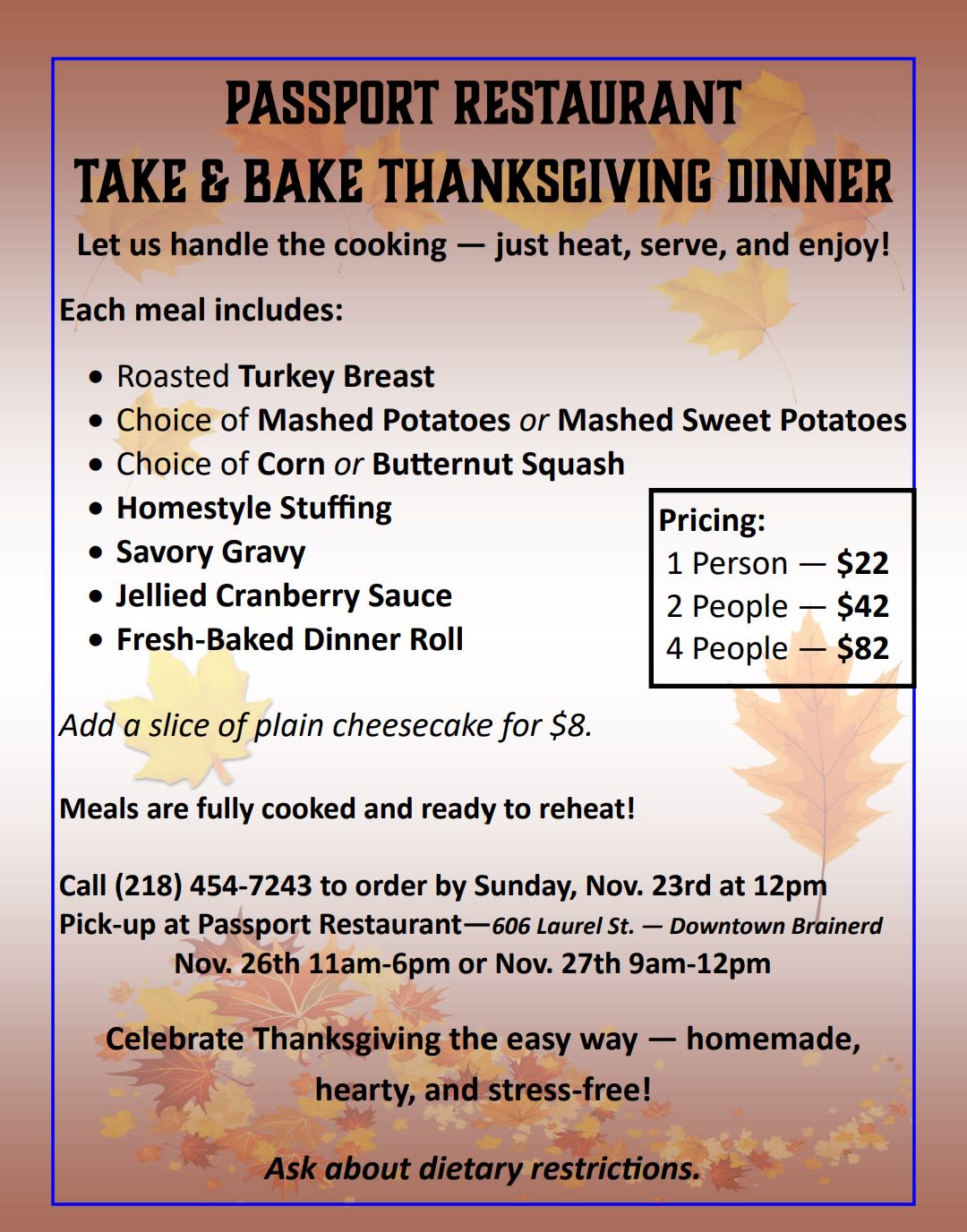 Call (218) 454-7243 to order by Sunday, Nov. 23rd at 12pm